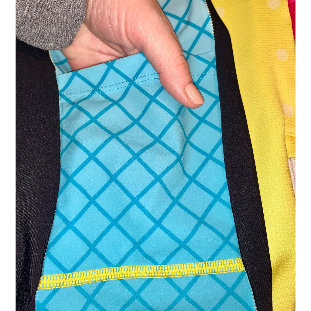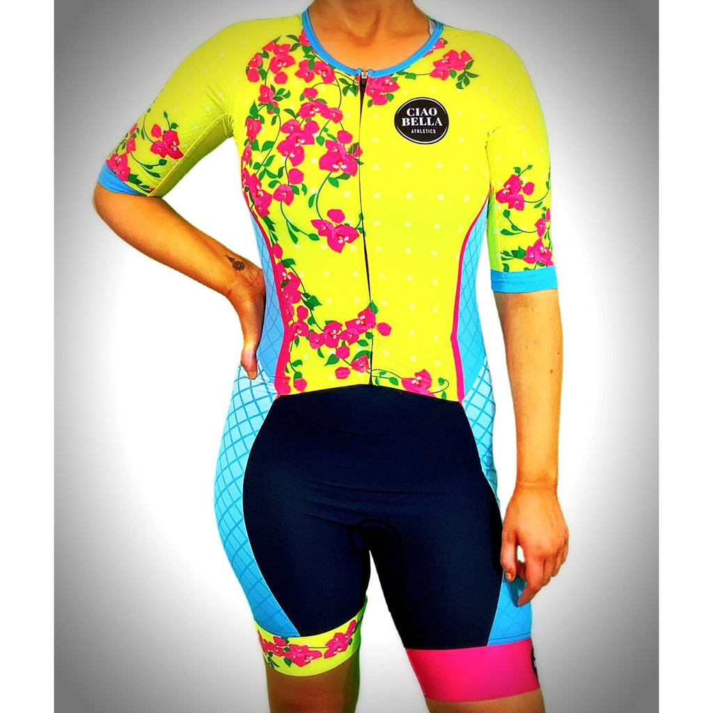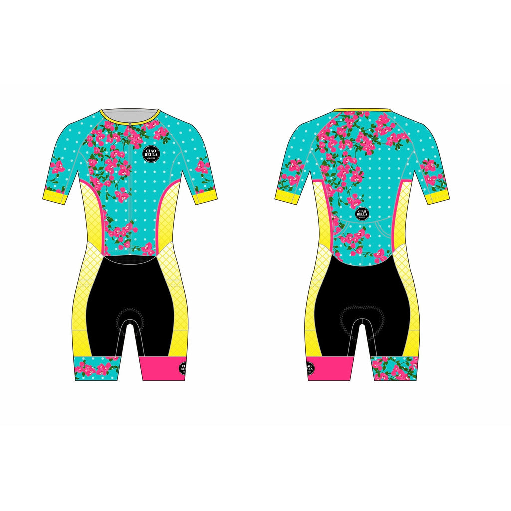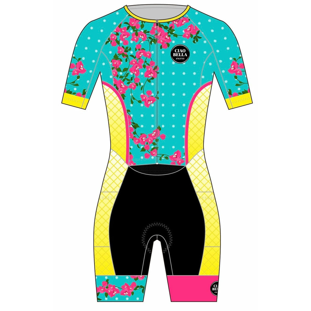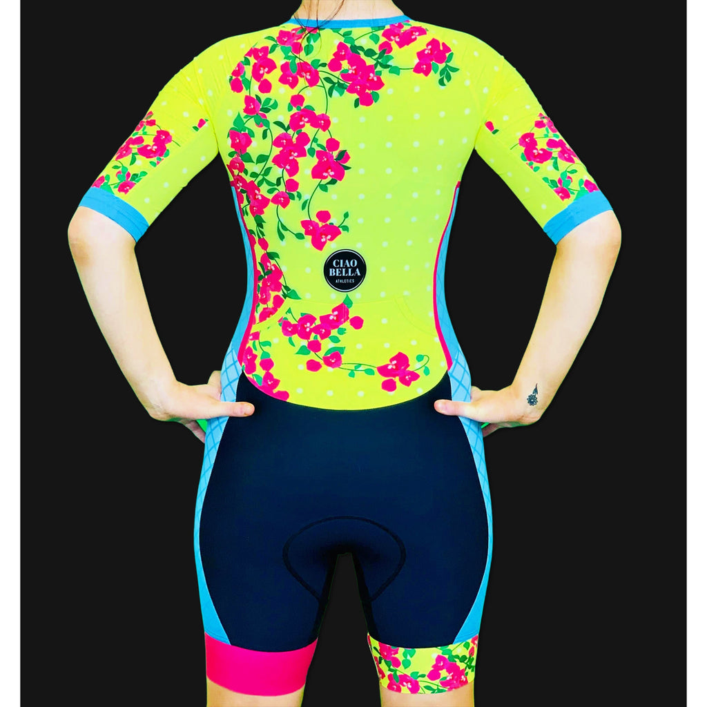 The fabric on this Cancun2 triathlon suit is some of the softest I've ever felt. I wanted to have a suit that was flattering and functional and I think this turned out spectacularly. The shorts waistband comes up and hits roughly around the waistline and the attached top sits over that. There aren't any seams directly in the underarm area for fewer chafe opportunities. The zipper is covered so you won't get little alligator bites (as my friend Nicole calls them). The shorts are nice and long and have the signature super grippy leg bands. There are two tiny pockets in the back to carry a few small items and also two larger pockets on the legs in front for gels or the like. And, of course, the Ciao Bella fleece chamois that runs lower in the thighs for a comfy bike and run. Bravo, I say. Bravo. The Cancun2 design is the second version of the original, but with a different color scheme.