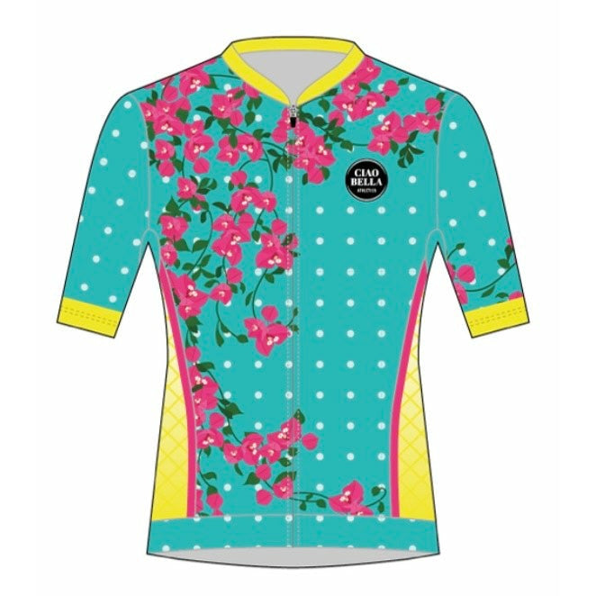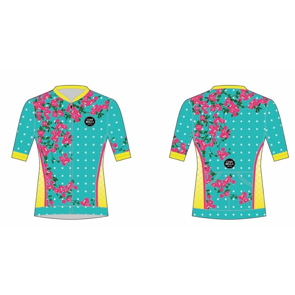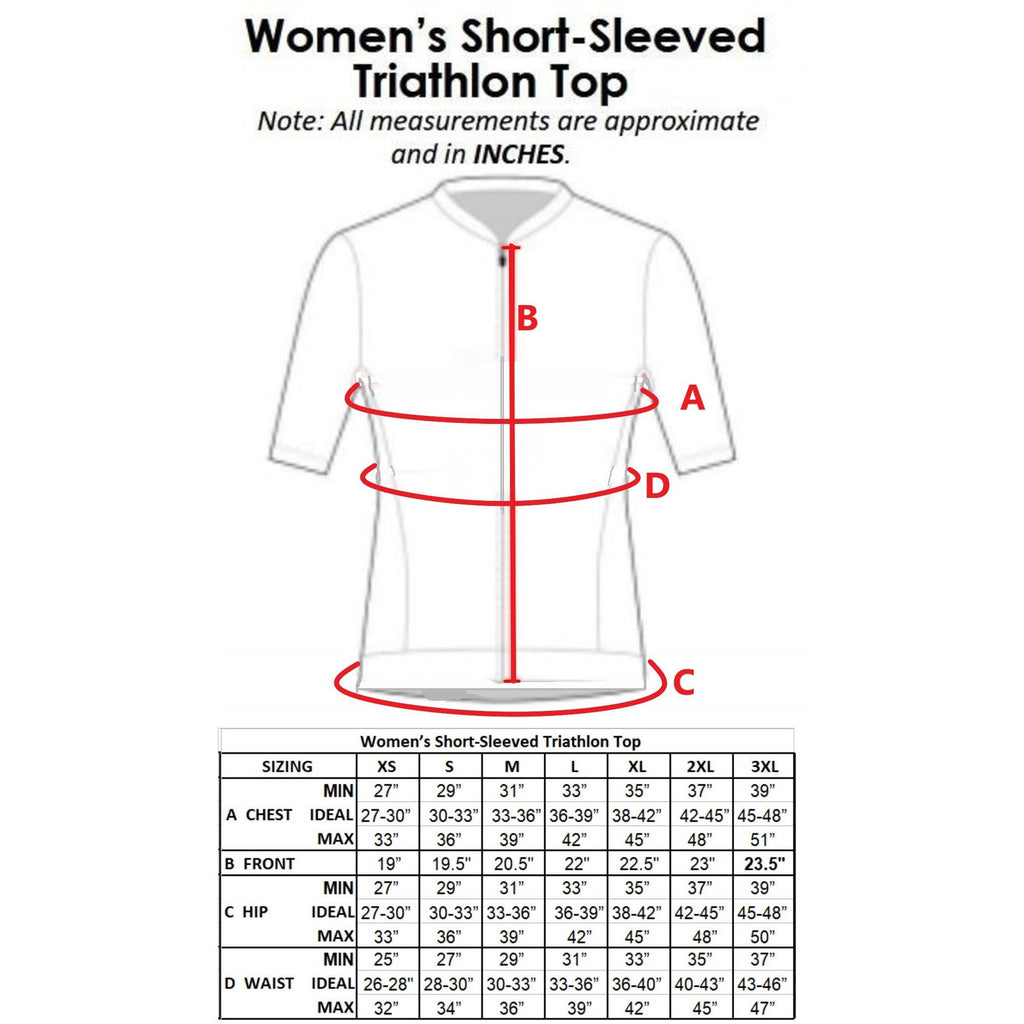 The Ciao Bella sleeved triathlon top in the Cancun2 Design is so, so comfy. I had this designed to go from the swim to the bike to the run in one fell swoop. The Italian fabric is buttery soft, breathable, and quick-drying. If you look at the armpits, I’ve made sure we don’t have any bothersome seams to rub you the wrong way when swimming or running. I’ve taken this top out on so many tests and have to say, it’s sublime. Elastic loops are hidden underneath on the inside of the top. Those elastic loops attach to hooks on the shorts so you won’t need to tug as much when training or racing to keep it in place. I recommend using them just on the run to keep the top in place due to a lot of tugging on the hook on the bike with each pedal stroke, which adds to stress to the fabric. Nobody needs more stress. And, if you don’t want to use them, they just stay tucked away. The waistband is super grippy, too. The top has two pockets in the back for easy access to your smaller tri necessities. This top is meant to be worn tight, so if you want a little breathing room, order one size up.