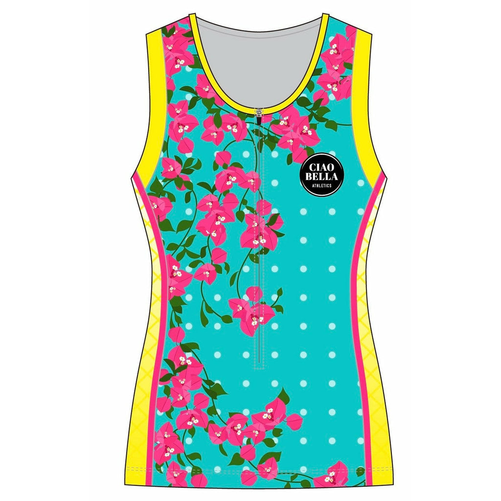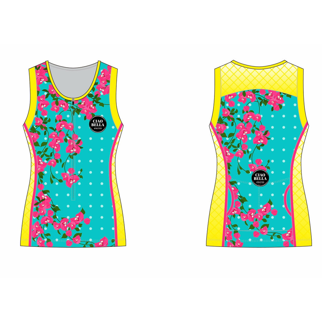 The Ciao Bella sleeveless tri-top with 1/4 zip singlet in the Cancun2 Design is soft and comfy yet a triathlon workhorse. The top boasts an elastic waist with a gripper and is tighter than our racerback tri top. I have added elastic loops that are hidden underneath the inside of the top. Those elastic loops attach to hooks on the shorts so you won’t need to tug as much when training or racing to keep it in place. Voila! And, if you don’t want to use them, they just stay tucked away. The top offers two small pockets in the back to stash things like lip balm (I cannot go without) or energy gels. A nice perk with this top is most any bra straps will work and stay hidden, too.