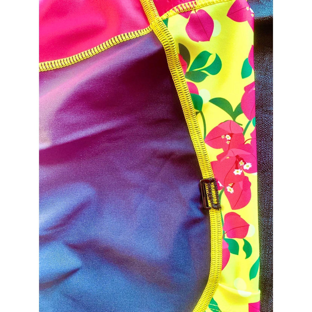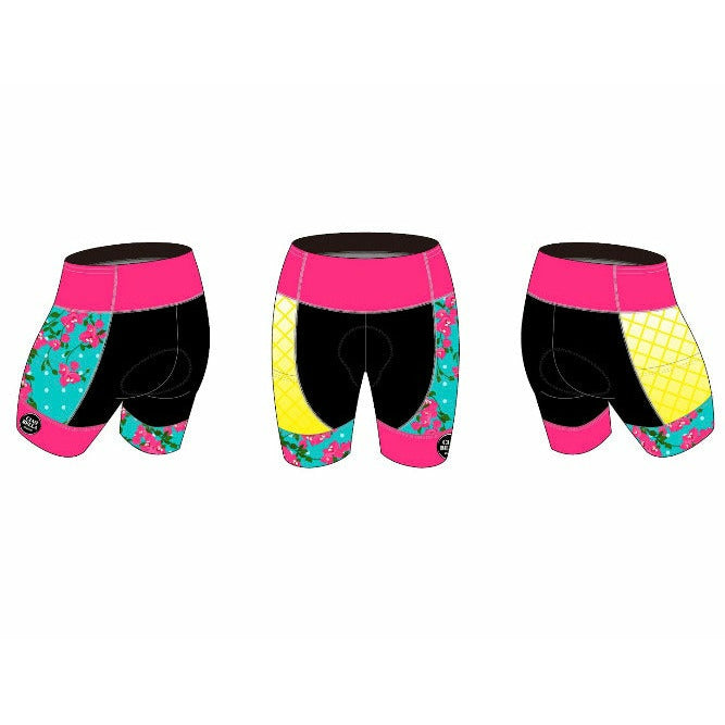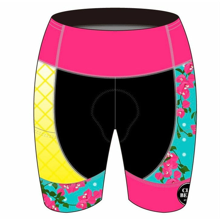 I wanted a pair of tri shorts that were both comfy and flattering at the same time. The Ciao Bella triathlon shorts in the Cancun2 Design marries super buttery Italian fabric with just the right cut to let you focus on training and racing rather than tugging and pulling. The fleece chamois is the piece de la resistance of these shorts and it comes down slightly longer in the thigh area to help with saddle and seam rubbing. The leg gripper is also a favorite of mine and keeps these babies from riding up and turning into bikini bottoms on the bike or run. I added two tiny pockets on the waistband for an emergency lip balm or whatever you want to be tucked away. Two hooks on the legs of the shorts are there to match up (if you choose to use them) with one of the triathlon tops and their hidden elastic loops. I've just added two deep pockets on either side of the shorts which can hold a few gels, some gummies or even a hamburger if you want.
