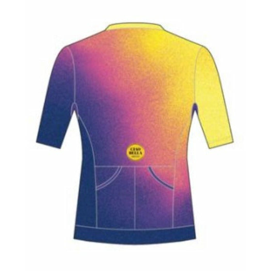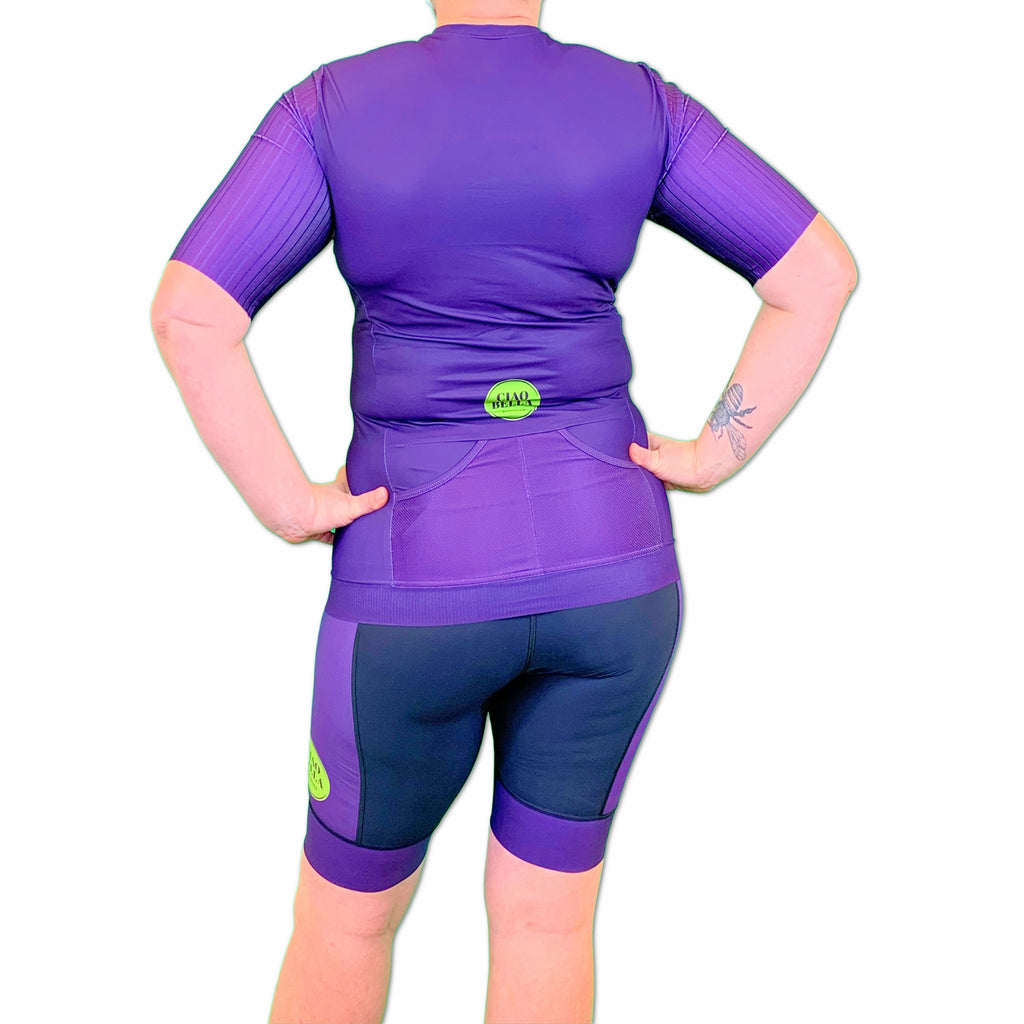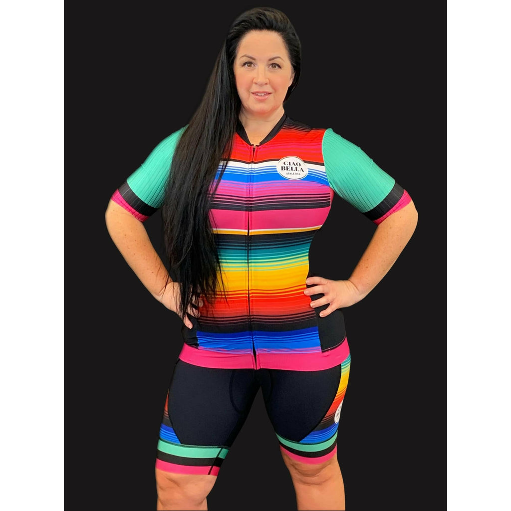 The Ciao Bella sleeved triathlon top in the Chula Vista Design is so, so comfy. I had this designed to go from the swim to the bike to the run in one fell swoop. The Italian fabric is buttery soft, breathable, and quick-drying. If you look at the armpits, I’ve made sure we don’t have any bothersome seams to rub you the wrong way when swimming or running. I’ve taken this top out on so many tests and have to say, it’s sublime. Elastic loops are hidden underneath on the inside of the top. Those elastic loops attach to hooks on the shorts so you won’t need to tug as much when training or racing to keep it in place. I recommend using them just on the run to keep the top in place due to a lot of tugging on the hook on the bike with each pedal stroke, which adds to stress to the fabric. Nobody needs more stress. And, if you don’t want to use them, they just stay tucked away. The waistband is super grippy, too. The top has two pockets in the back for easy access to your smaller tri necessities. This top is meant to be worn tight, so if you want a little breathing room, order one size up.