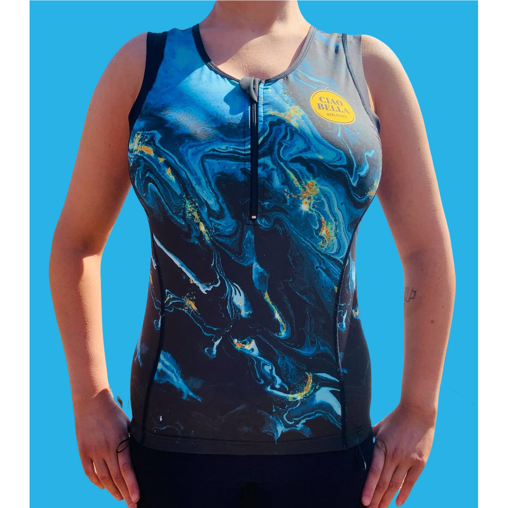 The Ciao Bella sleeveless tri-top with 1/4 zip singlet in the Year of the Rabbit Design is soft and comfy yet a triathlon workhorse. The top boasts an elastic waist with a gripper and is tighter than our racerback tri top. I have added elastic loops that are hidden underneath the inside of the top. Those elastic loops attach to hooks on the shorts so you won’t need to tug as much when training or racing to keep it in place. Voila! And, if you don’t want to use them, they just stay tucked away. The top offers two small pockets in the back to stash things like lip balm (I cannot go without) or energy gels. A nice perk with this top is most any bra straps will work and stay hidden, too.