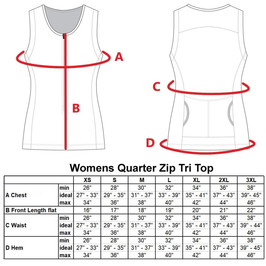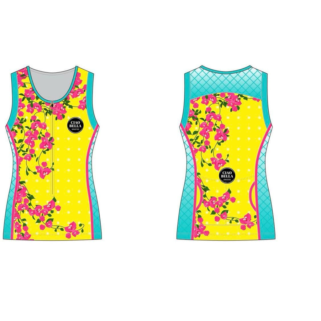 The Ciao Bella sleeveless tri-top with 1/4 zip singlet in the Cancun Design is soft and comfy yet a triathlon workhorse. The top boasts an elastic waist with a gripper and is tighter than our racerback tri top. I have added elastic loops that are hidden underneath the inside of the top. Those elastic loops attach to hooks on the shorts so you won’t need to tug as much when training or racing to keep it in place. Voila! And, if you don’t want to use them, they just stay tucked away. The top offers two small pockets in the back to stash things like lip balm (I cannot go without) or energy gels. A nice perk with this top is most any bra straps will work and stay hidden, too.