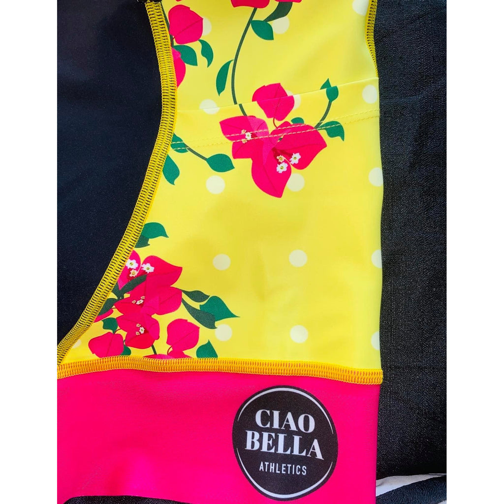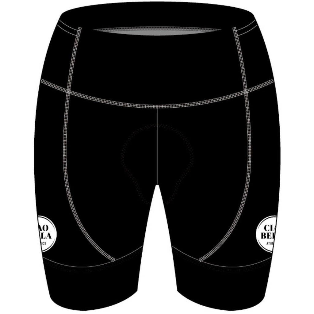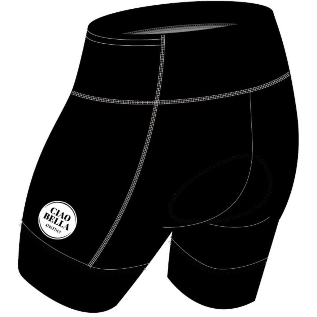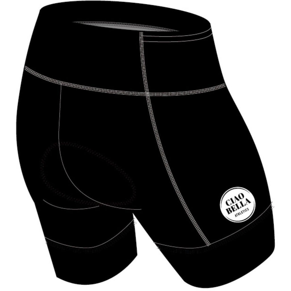 I wanted a pair of tri shorts that were both comfy and flattering at the same time. The Ciao Bella triathlon Black Pearl Design shorts marries super buttery Italian fabric with just the right cut to let you focus on training and racing rather than tugging and pulling. The fleece chamois is the piece de la resistance of these shorts and it comes down slightly longer in the thigh area to help with saddle and seam rubbing. The leg gripper is also a favorite of mine and keeps these babies from riding up and turning into bikini bottoms on the bike or run. I added two tiny pockets on the waistband for an emergency lip balm or whatever you want to be tucked away. Two hooks on the legs of the shorts are there to match up (if you choose to use them) with one of the triathlon tops and their hidden elastic loops. I've just added two deep pockets on either side of the shorts which can hold a few gels, some gummies, or even a hamburger if you want.
