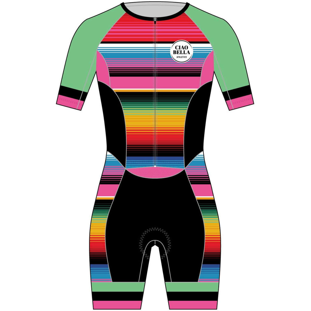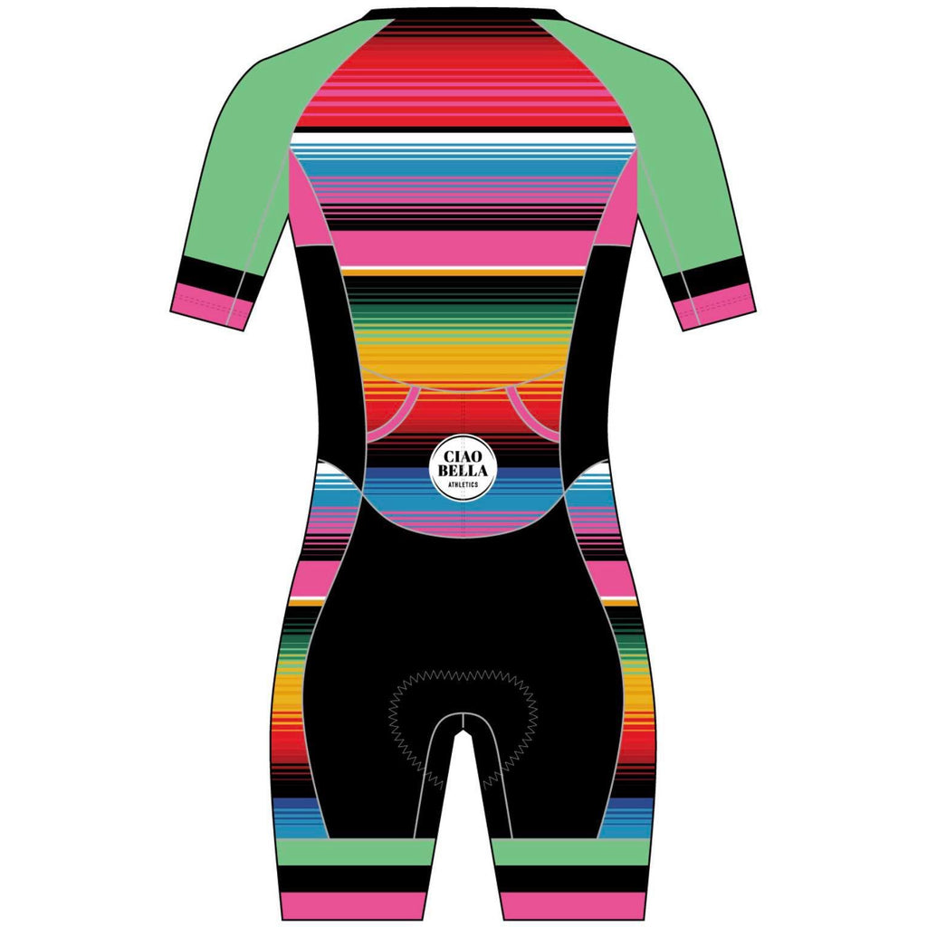 The fabric on this Sarape Design triathlon suit is some of the softest I've ever felt. I wanted to have a suit that was flattering and functional and I think this turned out spectacularly. The shorts waistband comes up and hits roughly around the waistline and the attached top sits over that. There aren't any seams directly in the underarm area for fewer chafe opportunities. The zipper is covered so you won't get little alligator bites (as my friend Nicole calls them). The shorts are nice and long and have the signature super grippy leg bands. There are two tiny pockets in the back to carry a few small items and also two larger pockets on the legs in front for gels or the like. And, of course, the Ciao Bella fleece chamois that runs lower in the thighs for a comfy bike and run. Bravo, I say. Bravo.