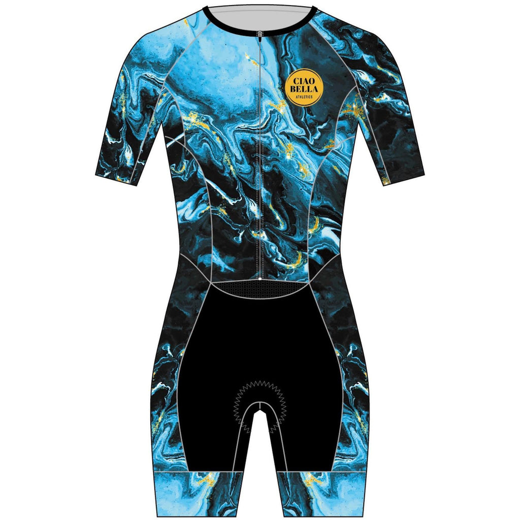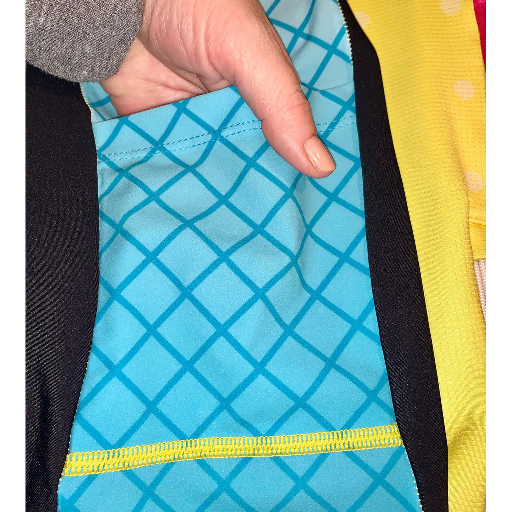 The fabric on this Bella Blue triathlon suit is some of the softest I've ever felt. I wanted to have a suit that was flattering and functional and I think this turned out spectacularly. The shorts waistband comes up and hits roughly around the waistline and the attached top sits over that. There aren't any seams directly in the underarm area for fewer chafe opportunities. The zipper is covered so you won't get little alligator bites (as my friend Nicole calls them). The shorts are nice and long and have the signature super grippy leg bands. There are two tiny pockets in the back to carry a few small items and also two larger pockets on the legs in front for gels or the like.